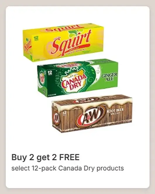 Hurry in and buy 2, get 2 free select 12-pack Canada Dry products in store.